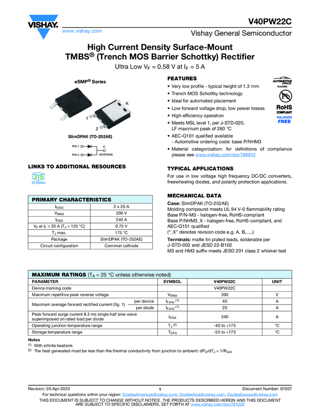 V40PW22C High Current Density Surface-Mount TMBS® (Trench MOS Barrier Schottky)...