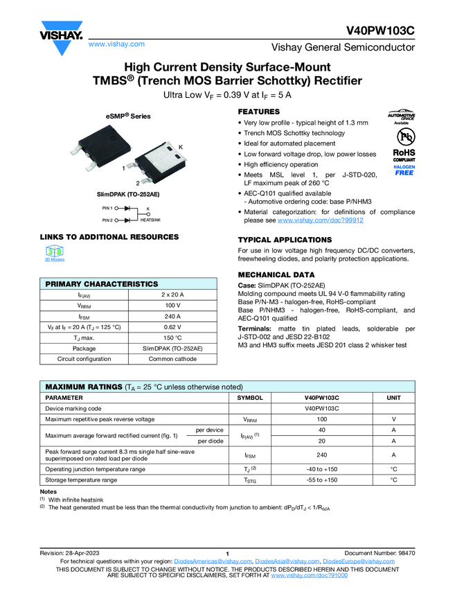 V40PW103C High Current Density Surface-Mount TMBS® (Trench MOS Barrier Schottky)...
