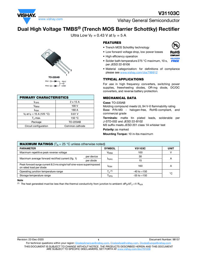 V31103C Dual High Voltage TMBS® (Trench MOS Barrier Schottky) Rectifier Ultra...
