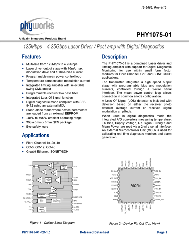 PHY1075 125Mbps to 4.25Gbps Laser Driver/Postamp with Digital Diagnostics