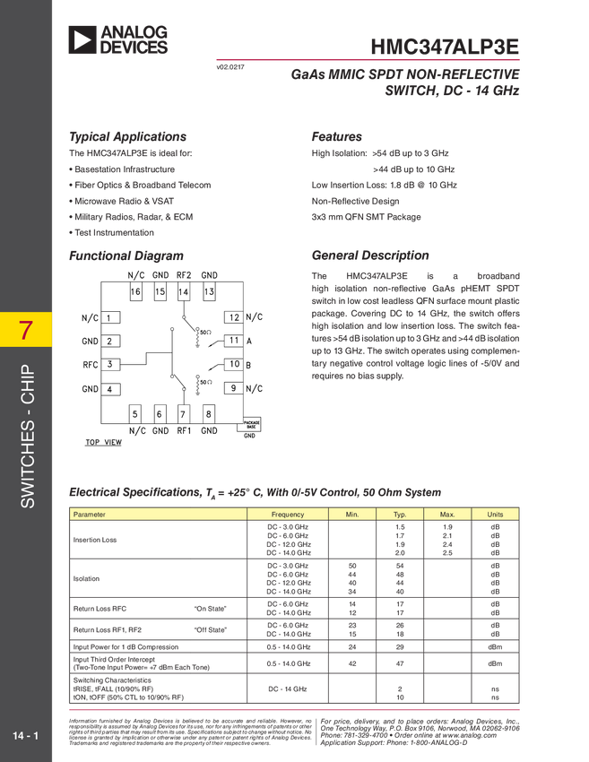 HMC347ALP3E GaAs MMIC SPDT Non-Reflective Switch, DC - 14 GHz
