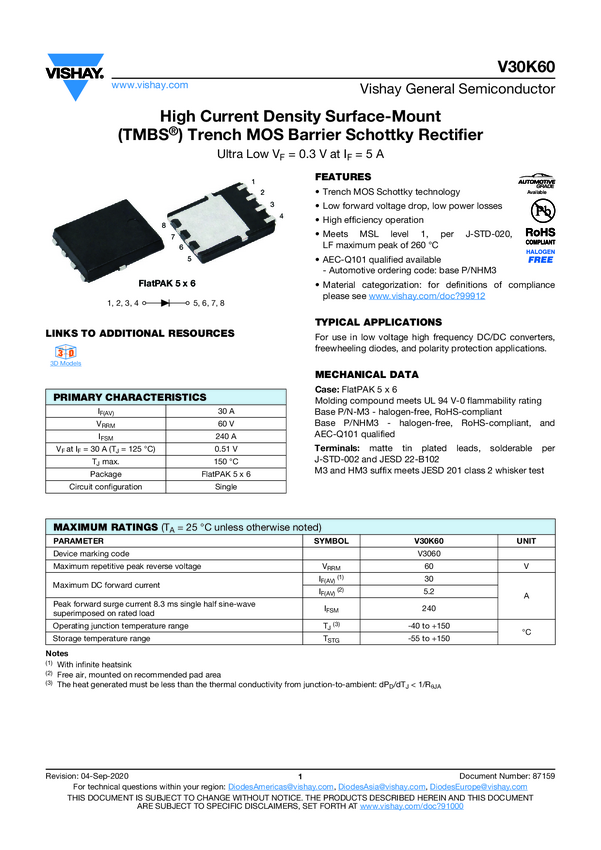 V30K60 High Current Density Surface-Mount (TMBS®) Trench MOS Barrier Schottky...