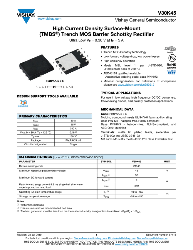 V30K45 High Current Density Surface-Mount (TMBS®) Trench MOS Barrier Schottky...