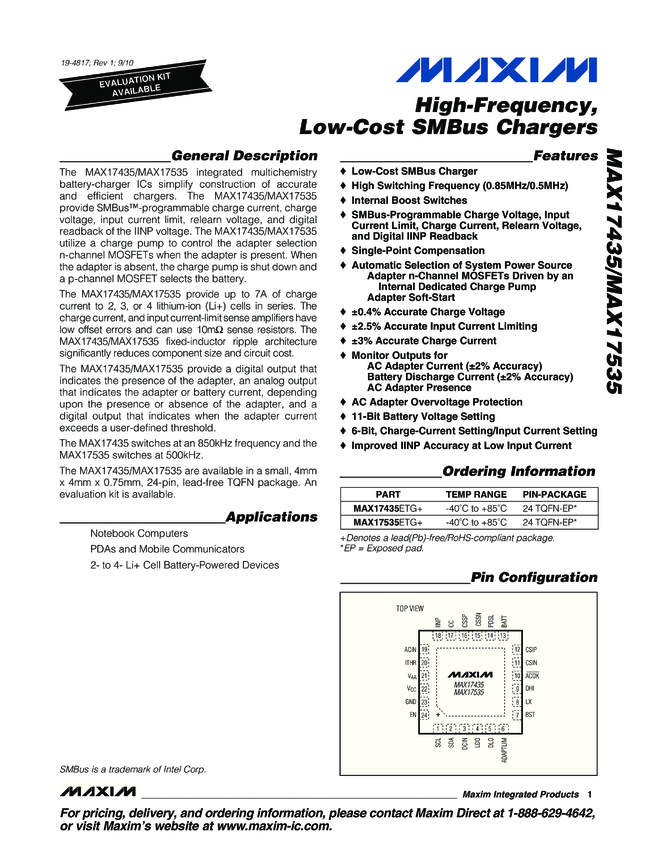 MAX17435 MAX17435, MAX17535 High-Frequency, Low-Cost SMBus Battery Chargers