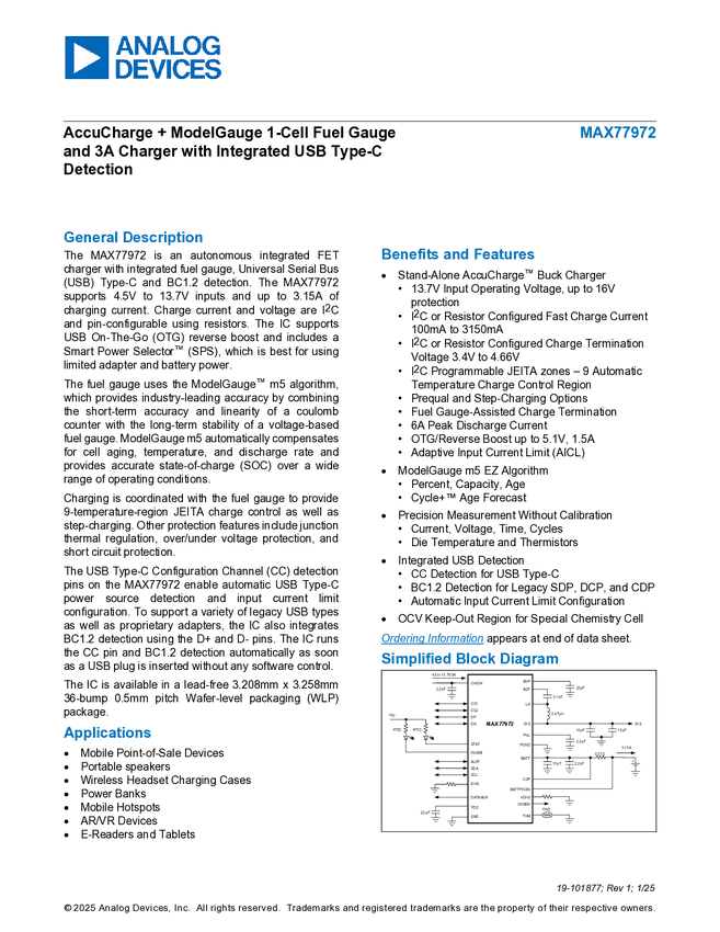 MAX77972 AccuCharge + ModelGauge 1-Cell Fuel Gauge and 3A Charger with Integrated US...