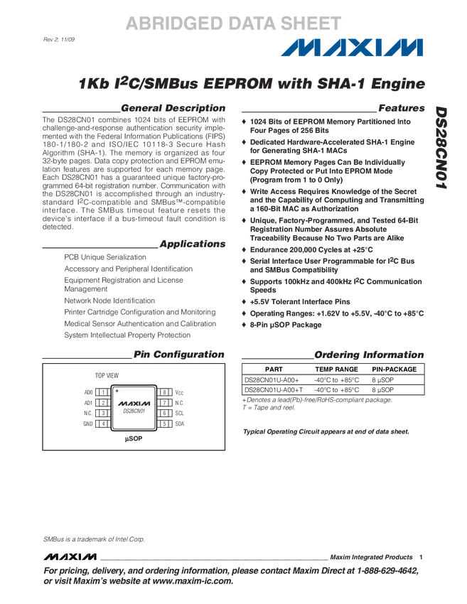 DS28CN01 1Kbit I²C/SMBus EEPROM with SHA-1 Engine
