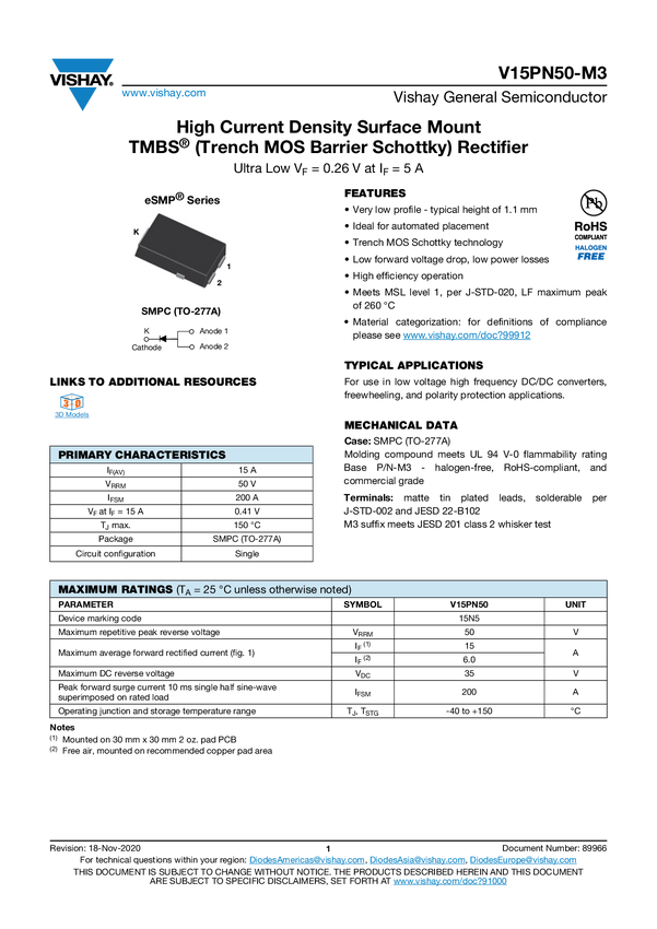 V15PN50-M3 High Current Density Surface Mount TMBS® (Trench MOS Barrier Schottky)...