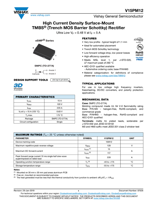 V15PM12 High Current Density Surface-Mount TMBS® (Trench MOS Barrier Schottky)...