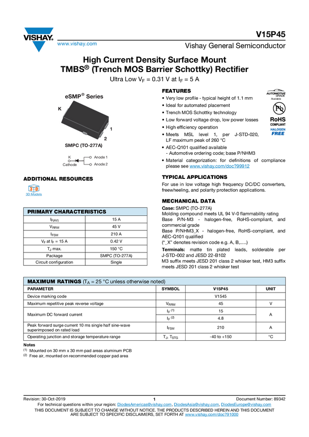 V15P45 High Current Density Surface Mount TMBS® (Trench MOS Barrier Schottky)...