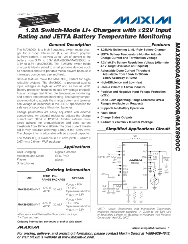 MAX8900 A, MAX8900B, MAX8900C 1.2A Switch-Mode Li+ Chargers with ±22V Input Rating...