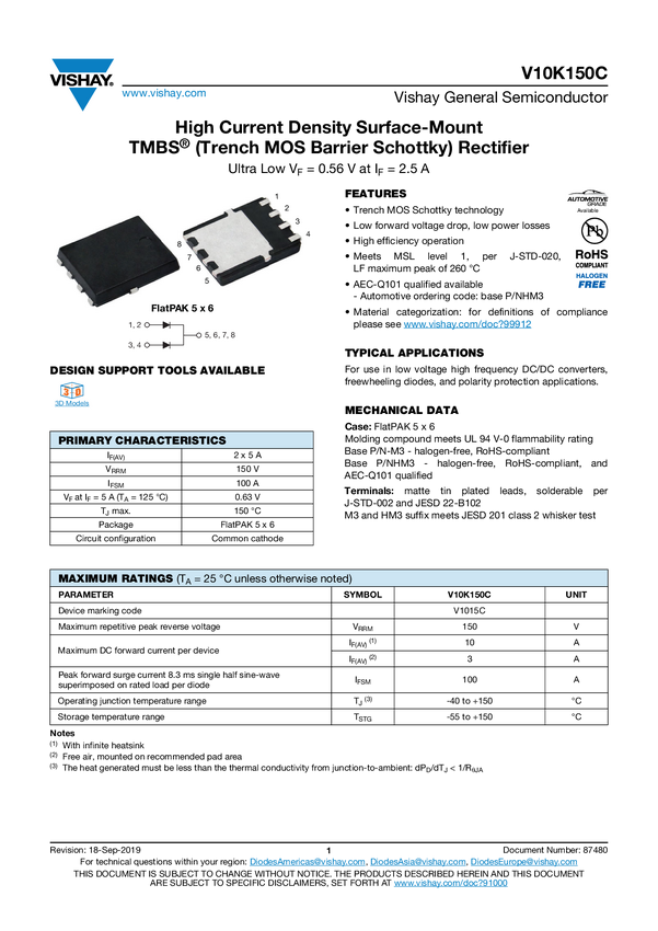 V10K150C High Current Density Surface-Mount TMBS® (Trench MOS Barrier Schottky)...