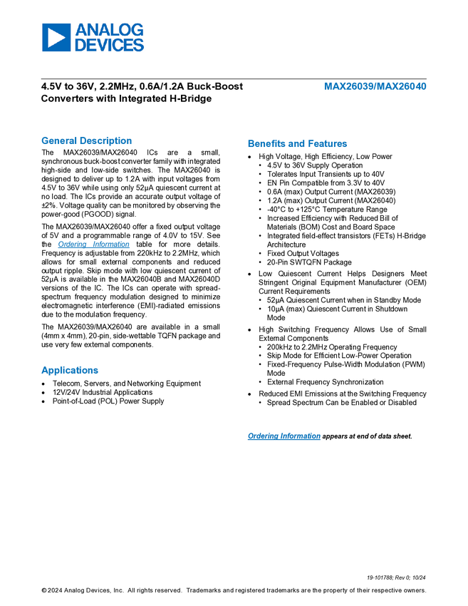 MAX26040 4.5V to 36V, 2.2MHz, 0.6A/1.2A Buck-Boost Converters with Integrated H-Brid...