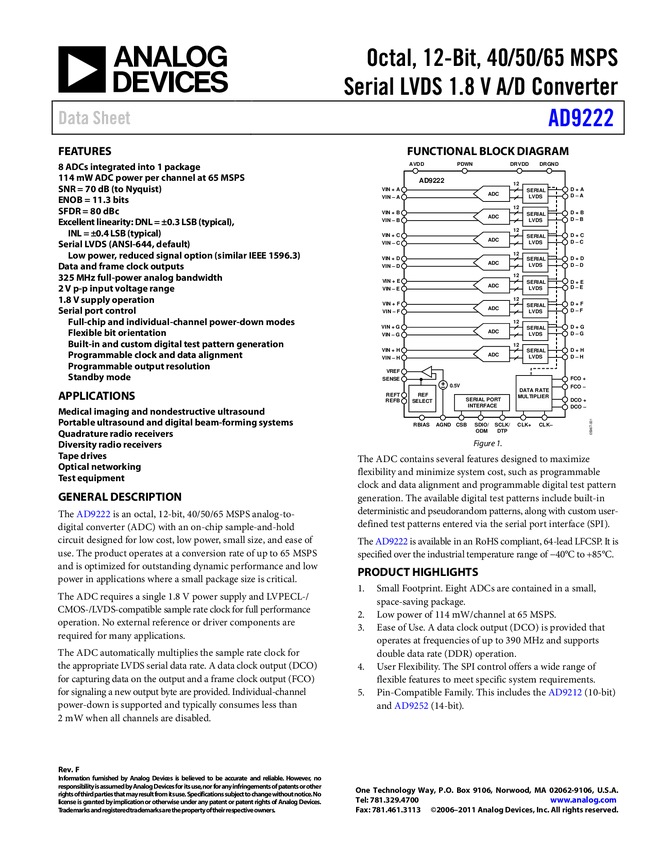 AD9222 Octal, 12-Bit, 40/50/65 MSPS Serial LVDS 1.8 V A/D Converter