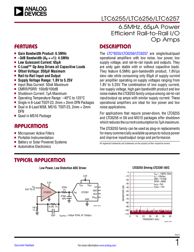 LTC6257 Dual 6.5MHz, 65μA Power Efficient Rail-to-Rail I/O Op Amps