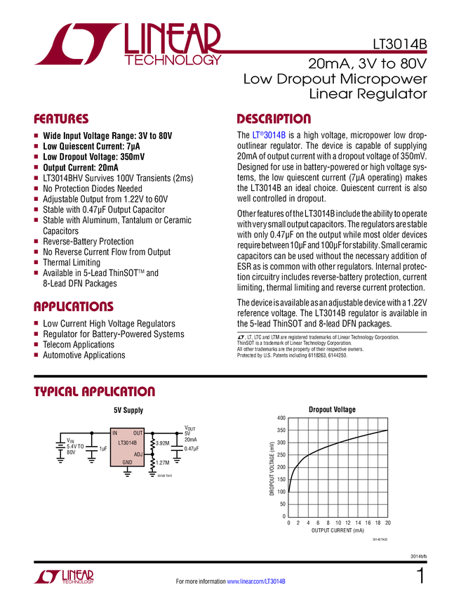 LT3014B 20mA, 3V to 80V Low Dropout Micropower Linear Regulator