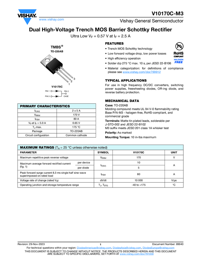 V10170C-M3 Dual High-Voltage Trench MOS Barrier Schottky Rectifier Ultra Low VF = 0.57...
