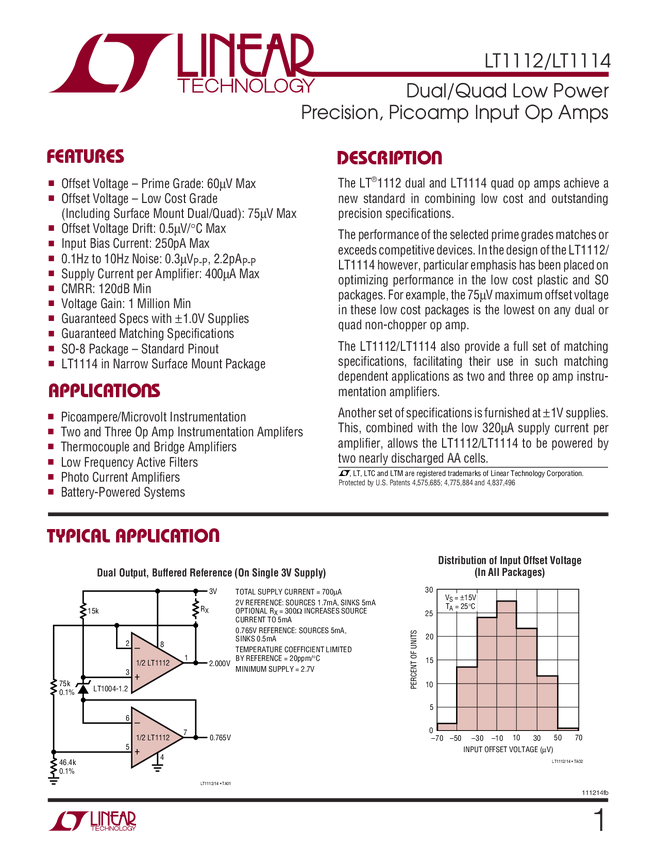 LT1112 Dual/Quad Low Power Precision, Picoamp Input Op Amps