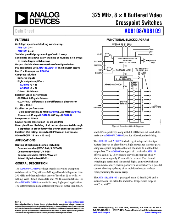 AD8109 325 MHz, 8 x 8 Buffered Video Crosspoint Switch (Gain = 1)