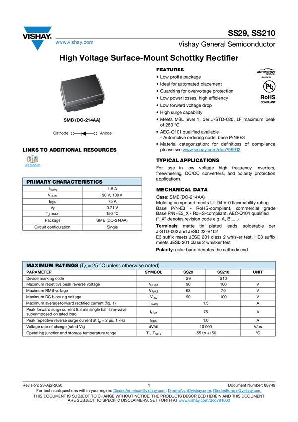 SS210 High Voltage Surface-Mount Schottky Rectifier