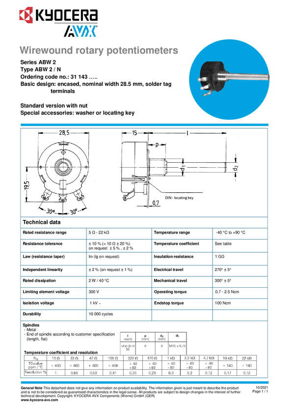 3114306004 Potencjometr drutowy ABW2 1W 1 KOHM +-10% TT Electronics A
