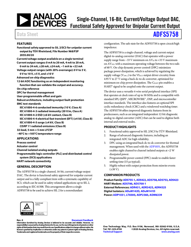 ADFS5758 Single-Channel, 16-Bit, Current/Voltage Output DAC, Functional Safety Appro...