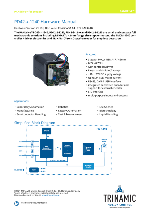 PD-1240 NEMA 17 smart stepper motor 10 to 30V, 22Ncm, 256 µSteps, SixPoint ramp con...