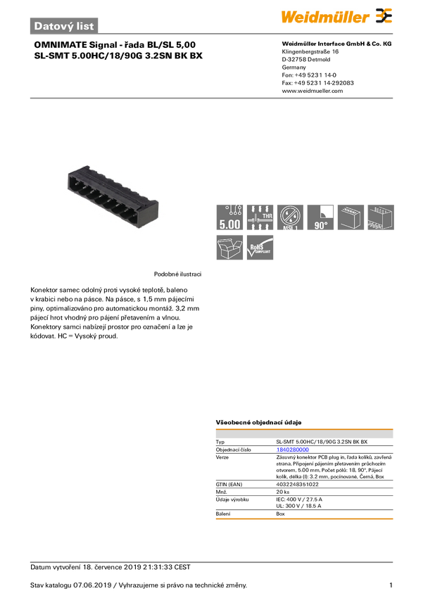 1840280000 Weidmüller Obudowa złącza pin męskiego na PCB BL/SL 5.00 Ilość pinów 18...