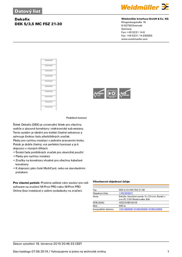 Znacznik urządzeń Weidmüller DEK 5/3,5 MC FSZ 21-30 1762320021, 500 szt.