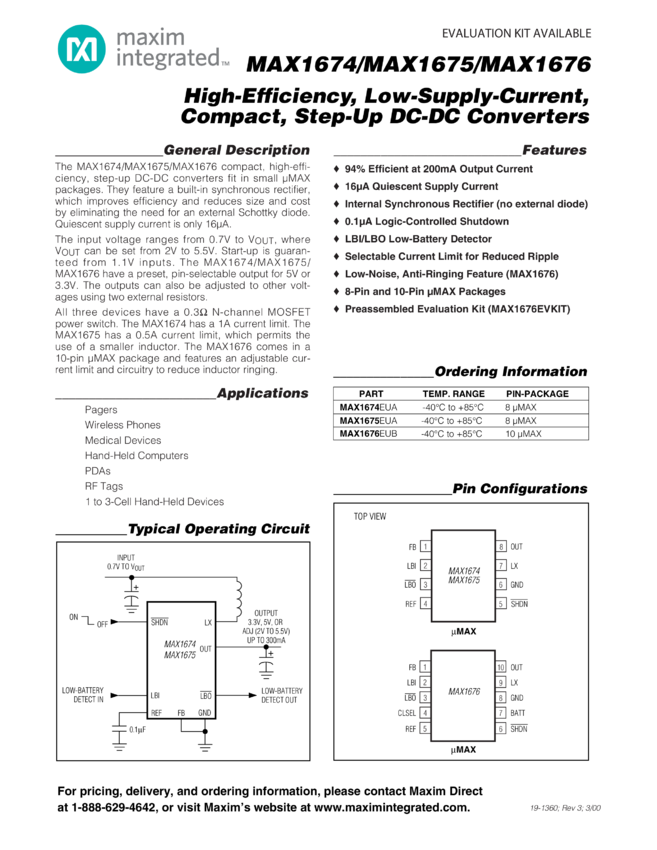 MAX1674, MAX1675, MAX1676 High-Efficiency, Low-Supply-Current, Compact, Step-Up DC-DC Converters