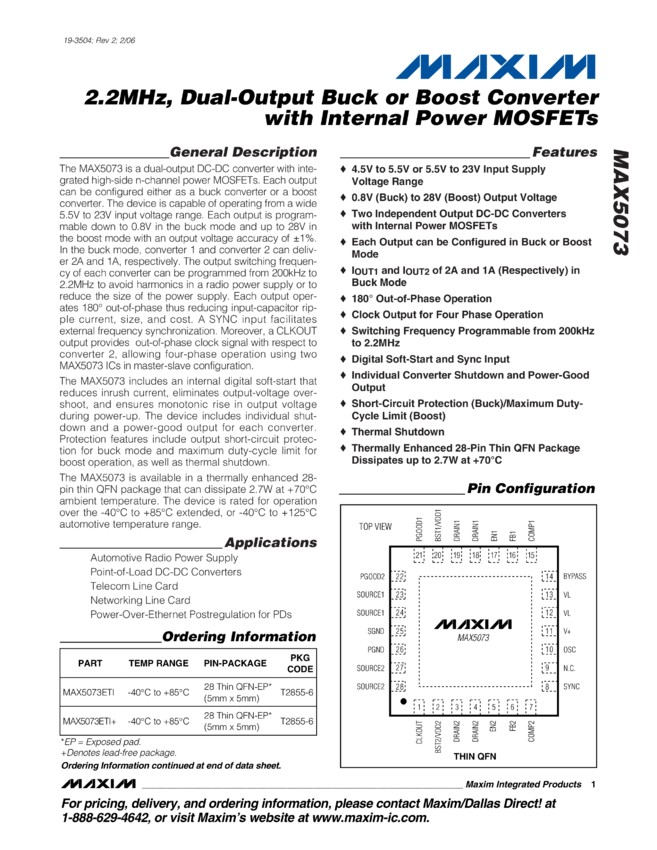 MAX5073 2.2MHz, Dual-Output Buck or Boost Converter with Internal Power MOSFETs