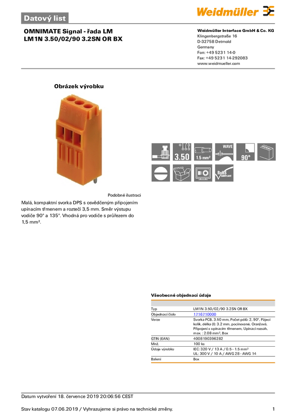 1716710000 Weidmüller 1716710000 Zaciski śrubowe 1.5 mm² Ilość styków 2 pomarańczowy 1...