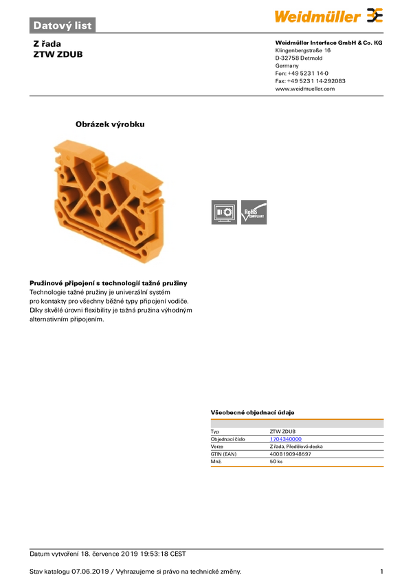 1704340000 Ścianka rozłączająca Weidmüller ZTW ZDUB 1704340000, 50 szt.