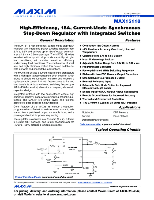 MAX15118 High-Efficiency, 18A, Current-Mode Synchronous Step-Down Regulator with Int...