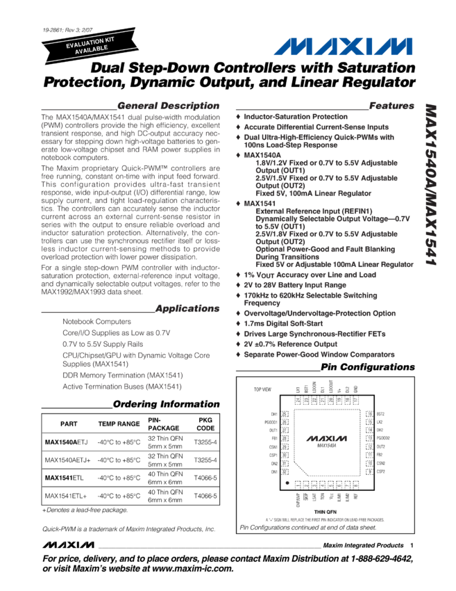 MAX1540 A, MAX1541 Dual Step-Down Controllers with Saturation Protection, Dynamic O...