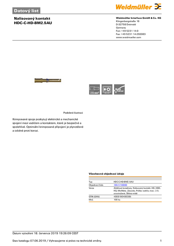1651710000 Weidmüller HDC-C-HD-BM2.5AU 1651710000 Złącza przemysłowe, Styk, HD, HDD, H...