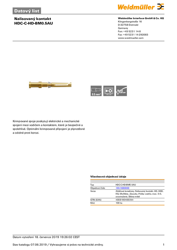 1651680000 Weidmüller HDC-C-HD-BM0.5AU 1651680000 Złącza przemysłowe, Styk, HD, HDD, H...