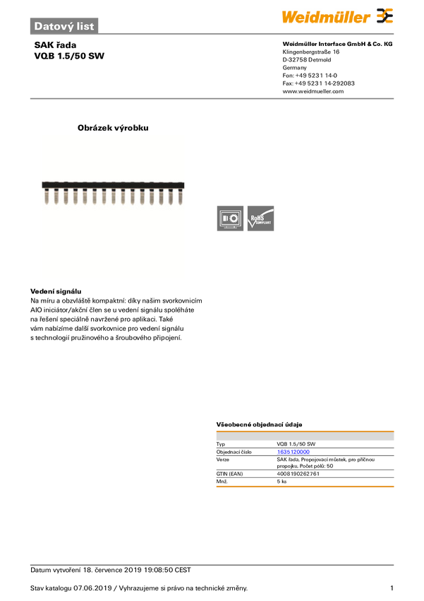 Łącznik krzyżowy Weidmüller VQB 1.5/50 SW 1635120000, 5 szt.