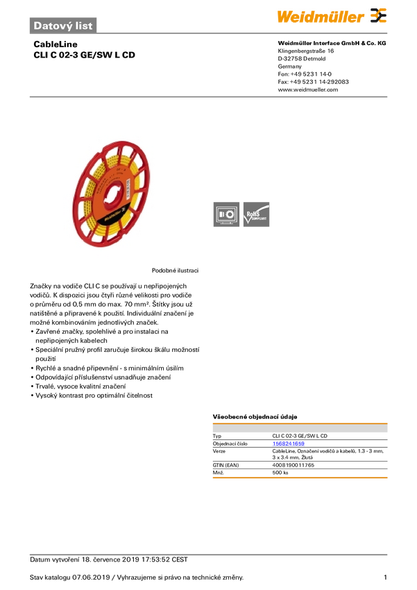 Weidmüller CLI C 02-3 GE/SW L CD Oznacznik kablowy Nadruk L Zakres średnicy zewnętrznej 1.3 do 3 mm 1568241659
