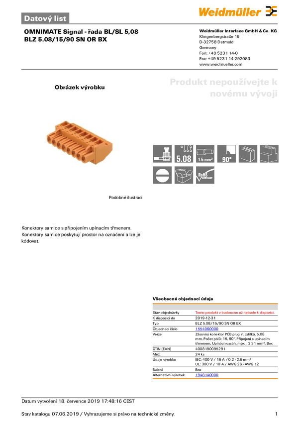 1554060000 Weidmüller Obudowa złącza pin żeńskiego na kabel BL Ilość pinów 15 Wymiary...