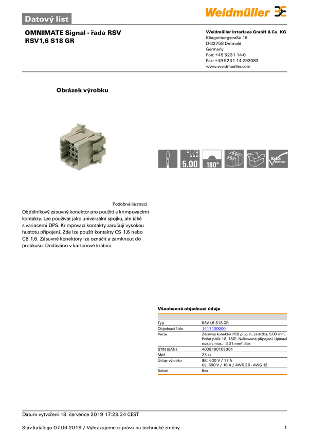 1417100000 Weidmüller 1417100000 Obudowa złącza pin męskiego na PCB RSV1,6 S18 GR, wir...