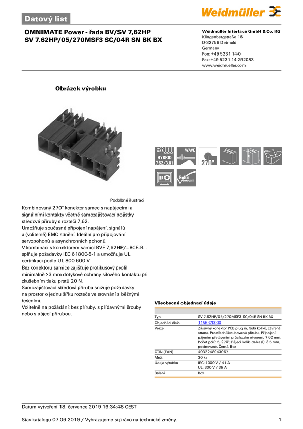 1156370000 Weidmüller 1156370000 Obudowa złącza pin męskiego na PCB SV 7.62HP/05&#...