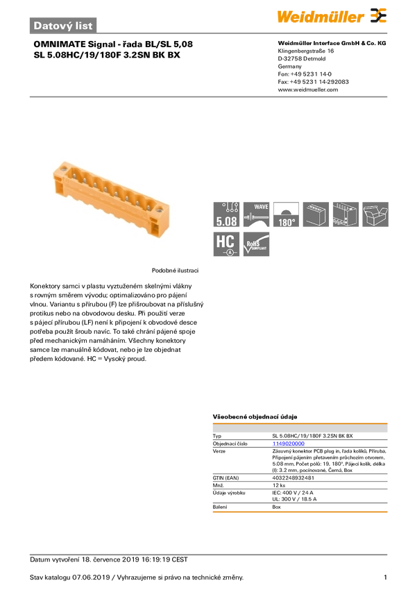 1149020000 Weidmüller Obudowa złącza pin męskiego na PCB BL/SL 5.08 Ilość pinów 19...