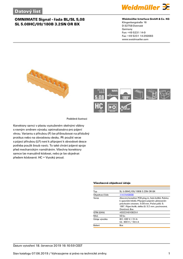Weidmüller 1147540000 Obudowa złącza pin męskiego na PCB SL 5.08HC/09/180B 3.2SN OR BX, wire-to-board, piny: 9, 24 A, 50