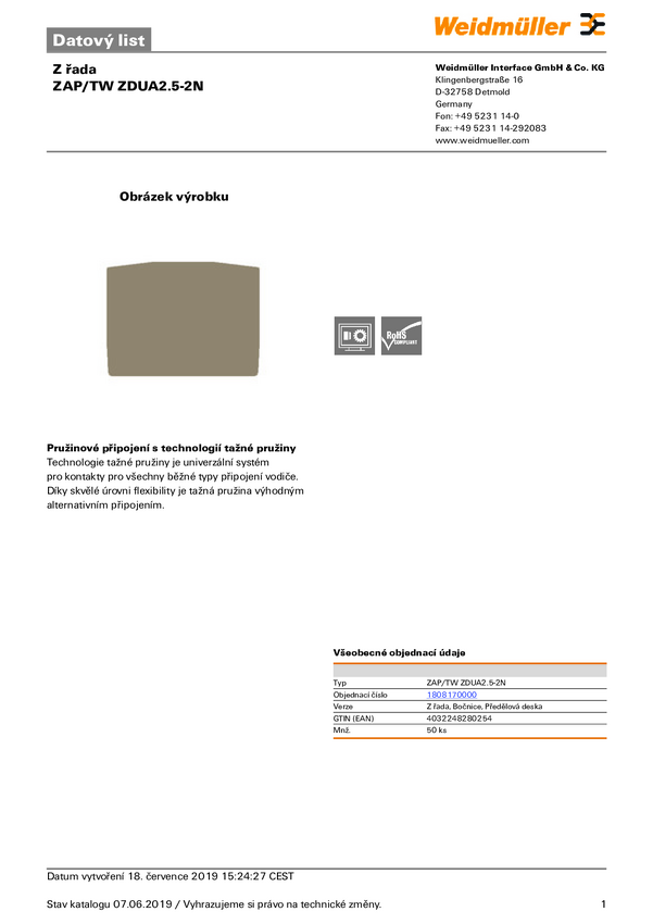 1808170000 Płyta zamykająca Weidmüller ZAP/TW ZDUA2.5-2N 1808170000, 50 szt.