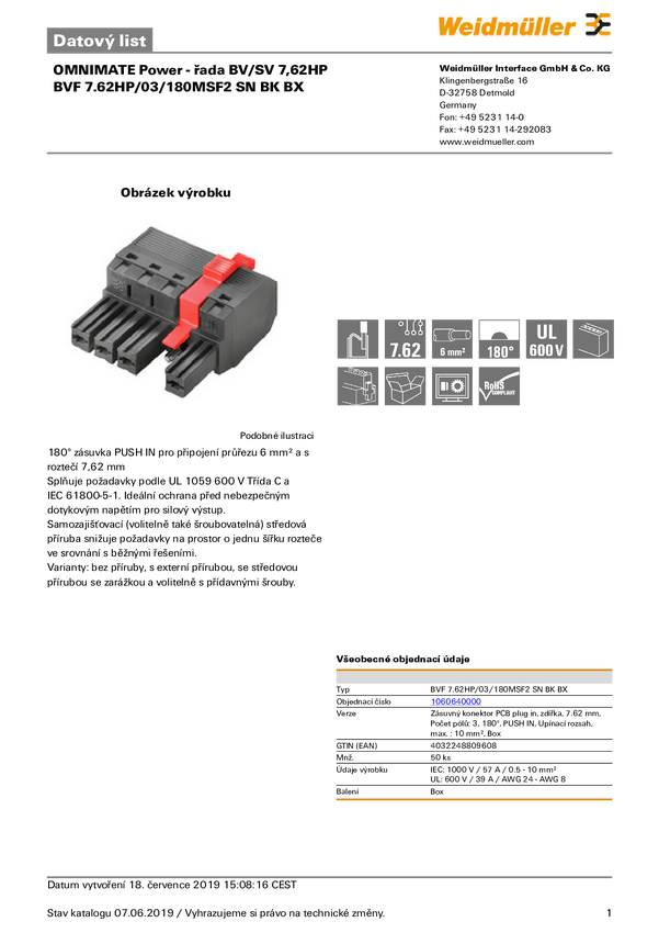 Weidmüller 1060640000 Obudowa złącza pin żeńskiego na kabel BVF 7.62HP/03/180MSF2 SN BK BX, wire-to-board, piny: 3, 36 A