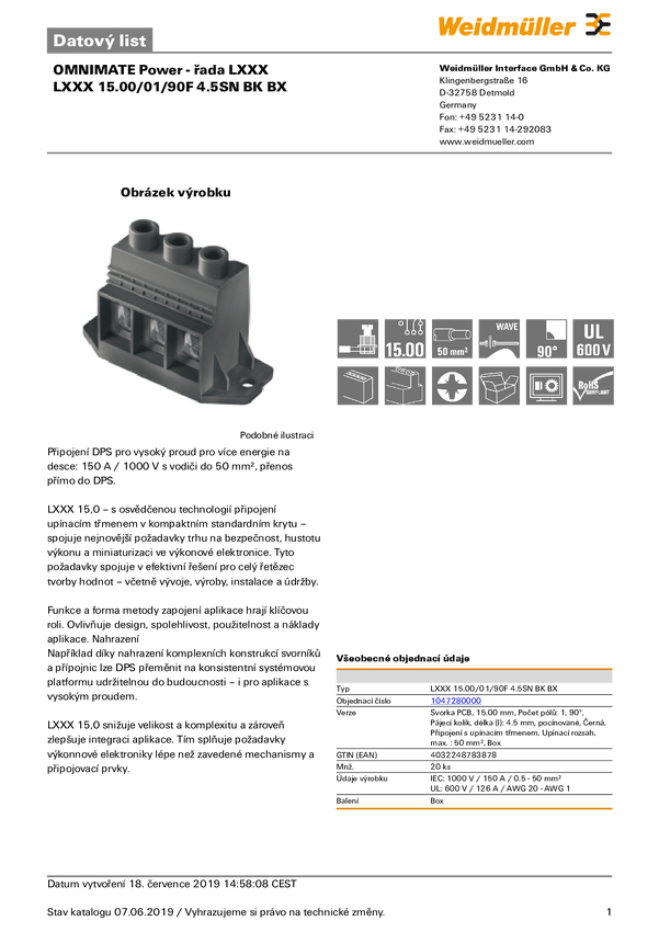 1047280000 Weidmüller 1047280000 Zaciski śrubowe 35 mm² Ilość styków 1 czarny 20 szt.