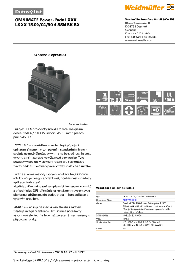 1047150000 Weidmüller 1047150000 Zaciski śrubowe 35 mm² Ilość styków 4 czarny 10 szt.