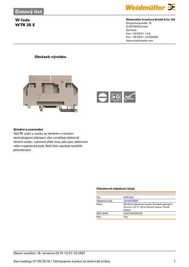 Seria W, Złączka rozłączająca, Przekrój pomiarowy: 35 mm², złącze śrubowe, montaż bezpośredni WTR 35 E 1045970000 ciemny