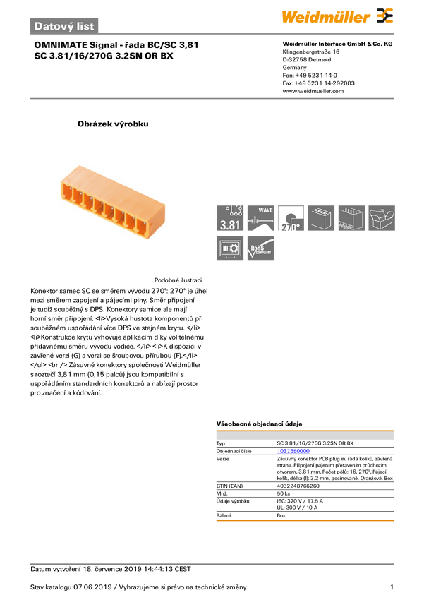 1037650000 Weidmüller Obudowa złącza pin męskiego na PCB BC/SC Ilość pinów 16 Wymi...