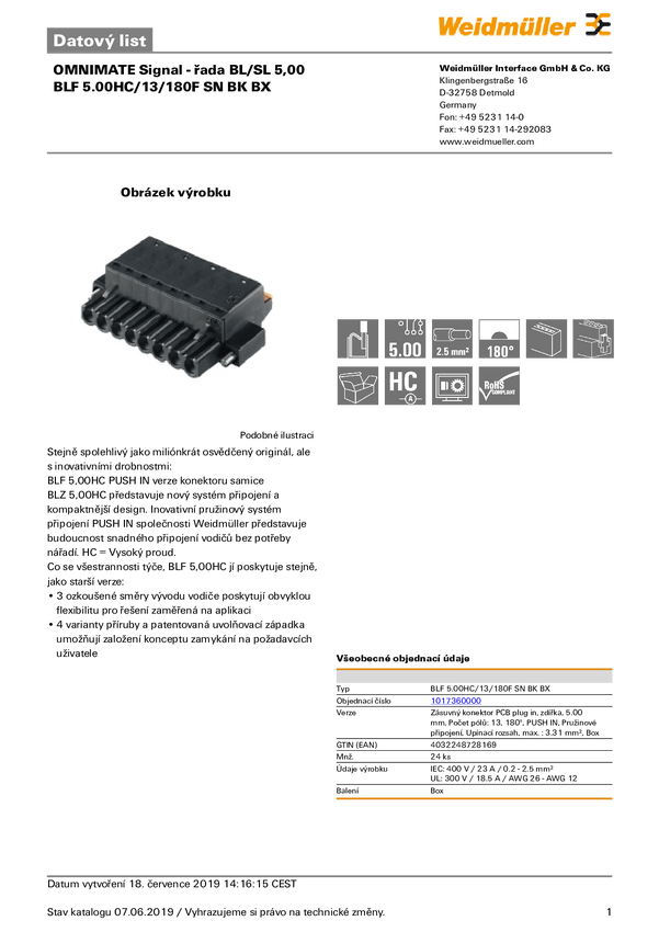 Weidmüller 1017360000 Obudowa złącza pin żeńskiego na kabel BLF 5.00HC/13/180F SN BK BX, wire-to-board, piny: 13, 18.5 A